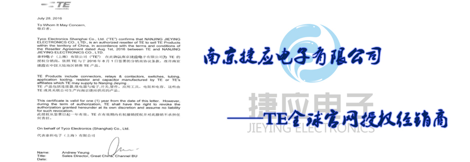 南京捷應(yīng)電子有限公司是國際無源器件品牌美國泰科電子(TE)在中國華東地區(qū)的主要通路商,代理經(jīng)銷旗下全系列產(chǎn)品包括TYCO(AMP)系列連接器、接插件、OEG、SCHRACK、P&B功率繼電器、美國RACHEM各類航空導(dǎo)線、熱縮套管、模縮套、標識產(chǎn)品、電線電纜。